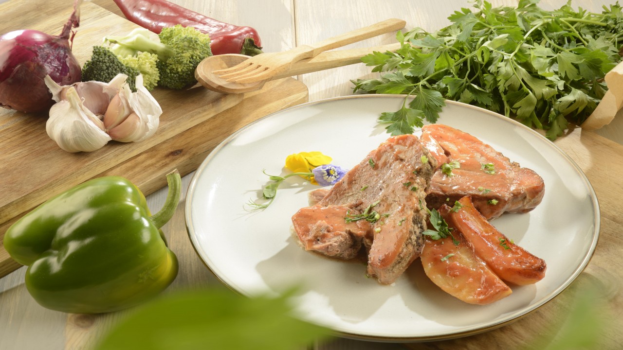 Rețetă: ceafă de porc, cartofi, ceapă, usturoi, ardei, morcovi, vin