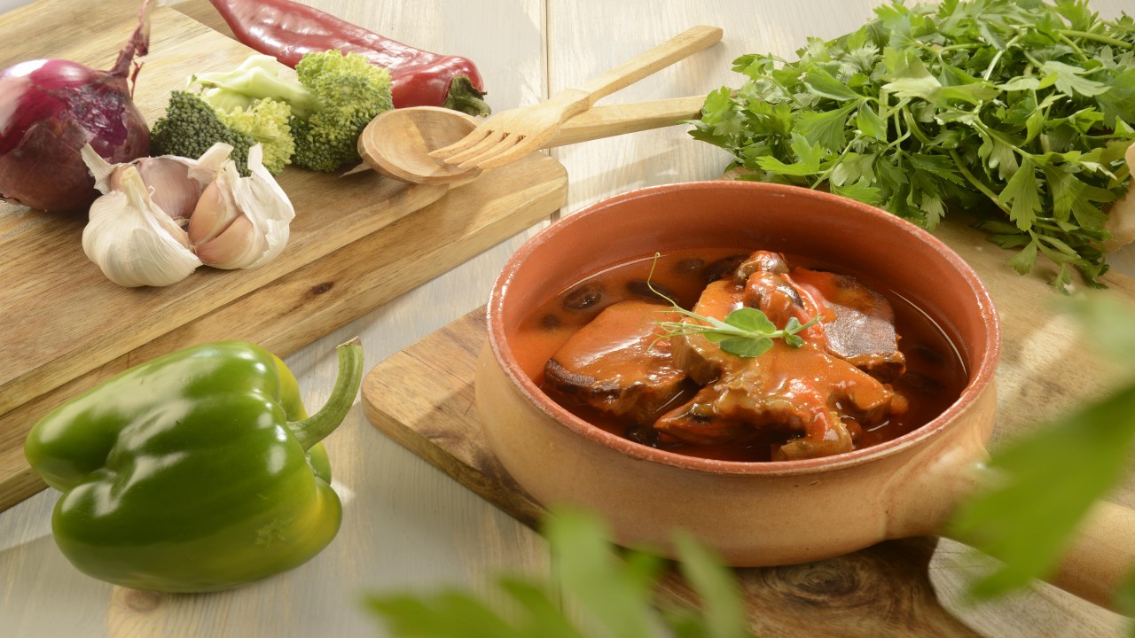 Rețetă: limbă de vită, măsline, ulei, sos de roșii, ceapă, țelină, vin, piper, foi de dafin