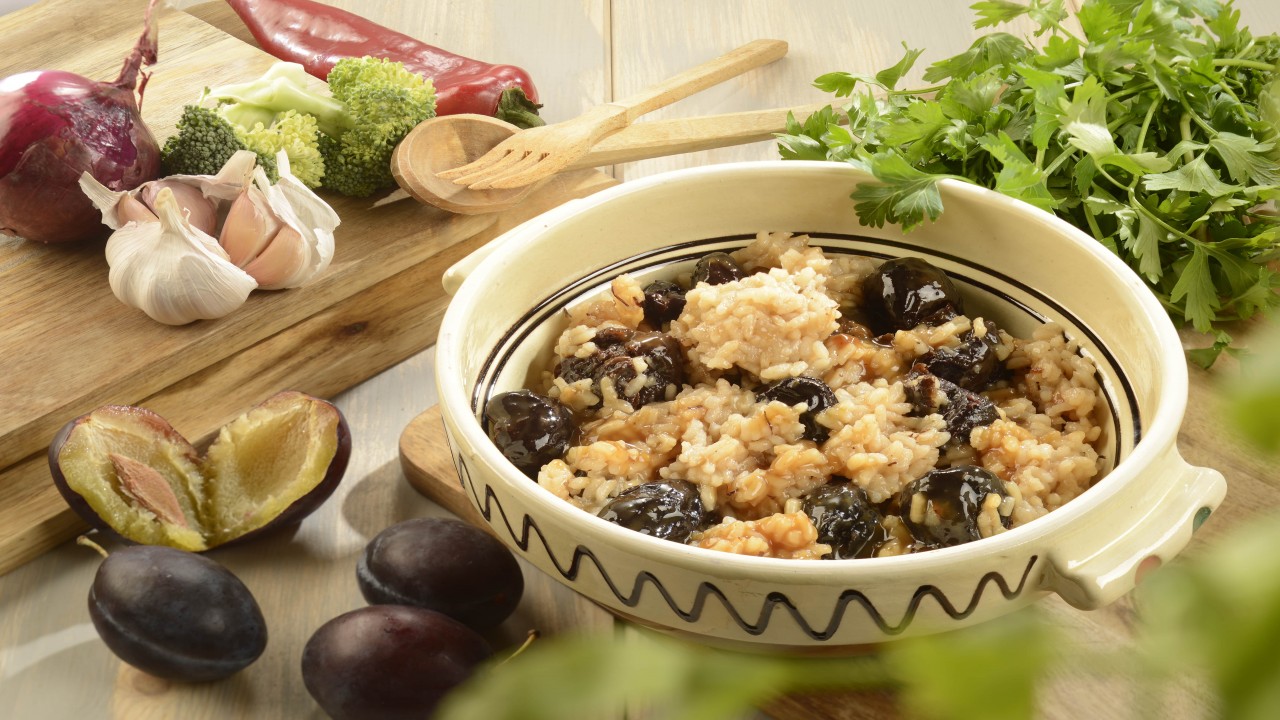 Rețetă: prune uscate, orez, zahăr, ceapă, ulei