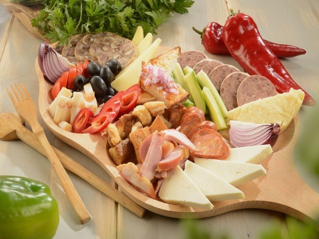 Platoul contine: șuncă, caltabos, toba, sorici, telemea de vaca, brânză de burduf, ceapa roșie, mix de masline, cupa cu zacusca, cupa cu vinete.