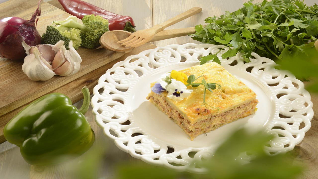 Rețetă: carne porc, cartofi, ceapă, ardei gras, ouă, sos de roșii, pătrunjel, sare, piper.