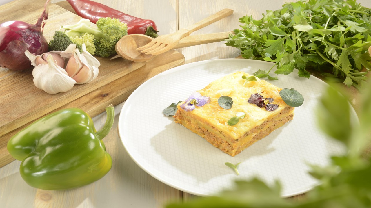 Rețetă: carne pui, cartofi, smântână, ouă, cașcaval, sos de roșii, pătrunjel