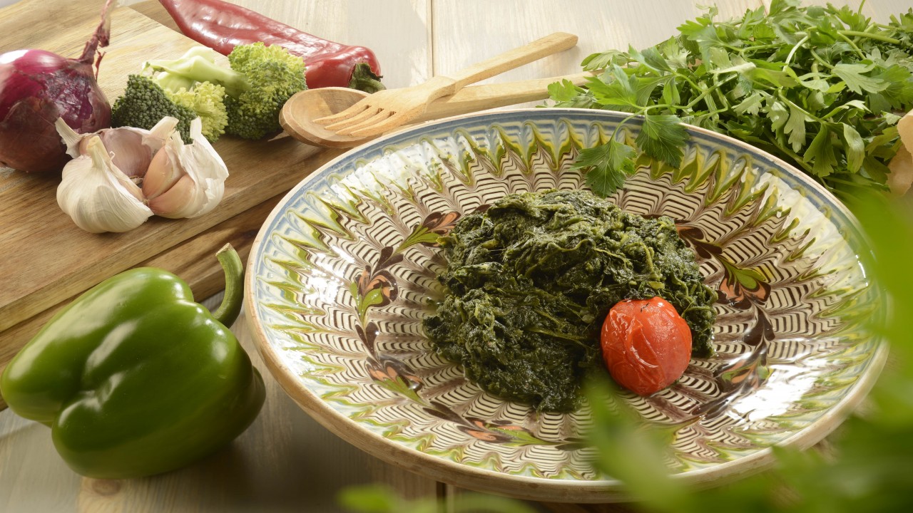 Rețetă: spanac frunze, ceapă, usturoi, ulei, pastă de tomate, sare, piper.